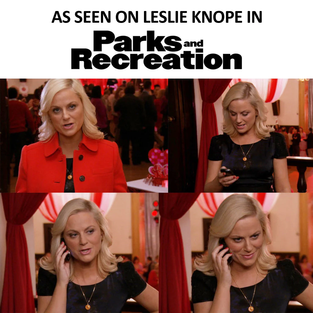 If you're wondering whether you've seen our bestselling scented necklace before, your eyes aren't deceiving you. This beautifully detailed example of kitsch kawaii jewelry was recently worn by Amy Poehler of Parks and Recreation fame in the episode āOperation Annā, season 4 aired via NBC on Feb. 2, 2012. (Click here for episode stills.) Paired with a gorgeous satin black dress, we think you'll agree Amy looked (and smelled) divine!